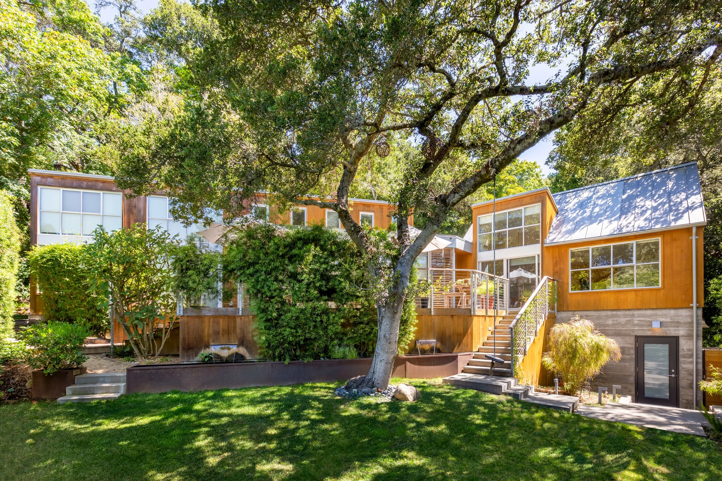 This sun-drenched iconic modern home, designed by notable architect, Peter Pfau with interior cabinetry and finishes by Henry Built, and built by New Dimensions Construction, offers the best lifestyle Mill Valley can offer. The line between the outdoors and in is blurred creating that perfect blend of indoor-outdoor living.The designer-seller selected the best materials such as grade-A clear red cedar for fencing, siding and interior treatments; zinc roofing and gutters; Fleetwood doors; Ipe decks; Dornbracht hardware; Pele Brooklyn custom lights, Ventana windows, Grenada and Sonoma tiles, Sonos sound throughout the house and garage, Toto toilets and Duravit sinks, Sub-Zero fridge and wine cooler, Miele dishwasher, Wolf induction cooktop and E-series electric and convection ovens; Nest thermostats and more...The original cottage was part of the historic Cushing estate property, and legend has it, hosted members of the Grateful Dead during its time.
